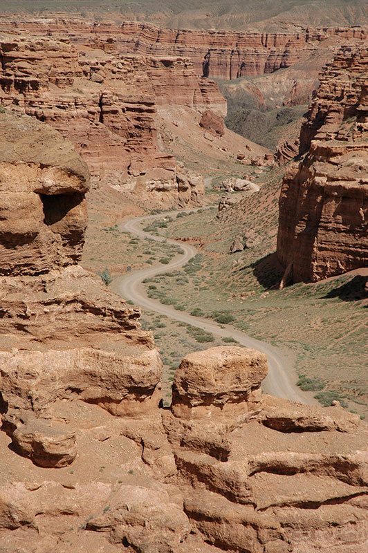 With the nearby border crossing closed, I have no alternative but to turn west once again, back to Almaty and the border crossing at Korday, where I had entered the country four weeks earlier. I stop en route to look at the dramatic Charyn Canyon, which drops down from the green mountain steppe in a beautifully eroded valley of red sandstone, highly reminiscent of the American south-west. The next day I drive to the busy border crossing of Qorday, thus completing a loop of almost six thousand kilometres over the last four weeks on the Kazakh Steppe.
