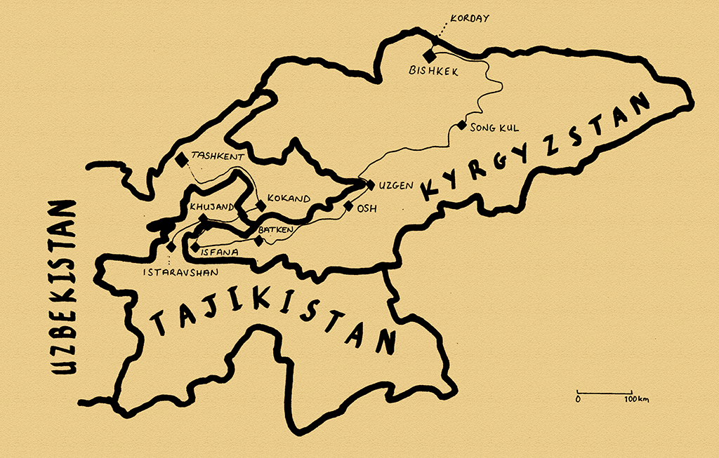 More than two-and-a-half millennia of history are contained within this broad, mountain-ringed lowland at the western edge of the Tien Shan, where the Naryn and Kara Darya Rivers join to form the Syr Darya. It was along this river that Herodotus’ knowledge of the world ended; the edge of civilisation. It was here that Alexander the Great established his most far-flung city, and where the Chinese first encountered the Indo-European civilisations to west, establishing the Silk Road in the first century BCE, and later making Fergana a centre for silk production in a tradition which endures today. This was the stomping ground of Genghis (Chinggis) Khan and Timur (Tamerlane) and Fergana’s most famous scion, Babur, patron of Kabul, who went on to found the Mogul Empire in India.