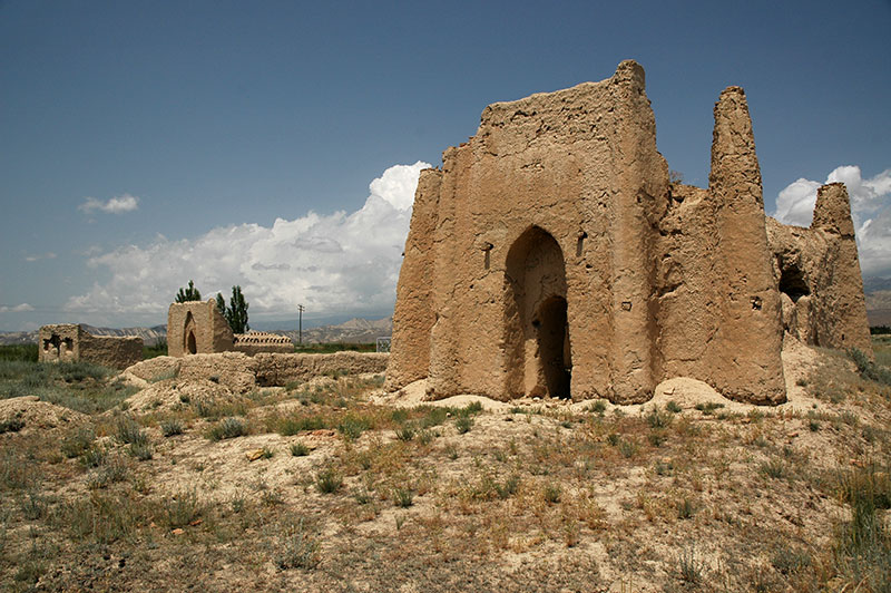 I descend into the sweltering Fergana Valley the next morning, stopping briefly in the uninteresting city of Jalalabad, where I join the M41 Highway and continue south to the smaller town of Uzgen. Like Balasagun, Uzgen was for a period a capital of the Kara-Khanid Khanate, which lasted from 999 to 1218, and it is here that I find Kyrgyzstan’s greatest architectural ensemble. Next to the Kara Darya River sit three fine, conjoined, red-brick mausolea, one of which features an exquisite frieze of terracotta inlay around its arched entrance portal, said to be the precursor of the dazzling turquoise and lapis-tiled mausoleum complex of Shah-i Zindah in Samarkand. Next to the mausolea is an eleventh century minaret in the same red-brick, finer and taller than that at Balasagun with attractive, alternating bands of geometric brickwork. These buildings are some of the few architectural remnants of the Kara-Khanids; a dynasty who oversaw an important cultural syncretism during which Transoxiana becoming linguistically Turkic, but when simultaneously its Turkic inhabitants became more influenced and assimilated into settled, Persian and Arabian-Islamic culture. The Kara-Khanids were eventually weakened successively by the Seljuks, Kara-Khitans and Khorezmians, until the Mongols came in 1218 and swept away all that had preceded them. Nevertheless, the Kara-Khanids left an important cultural legacy, which can still be felt today.