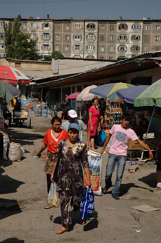 It was with this as a backdrop that I made my first visit to Osh, Kyrgyzstan’s second city, a very ancient settlement poised between nomadic and settled worlds, a city which grew with the ancient Silk Road and is still renowned today for having one of the largest bazaars in Central Asia. Babur described Osh with fondness, though I find little reason to favour it. My first impressions are of a city with strong, almost South Asian squalor; chaotic traffic, stalls encroaching onto the streets, taxis stopped at the roadside obstructing traffic, pedestrians walking without regard to traffic, roadside gulleys stinking of sewage-tainted stagnant water, filled with decomposing rubbish and plastic garbage (here mostly beer bottles) and feral street children in tattered clothes holding their hands out hopefully to passers-by. Everywhere is broken, crumbling concrete, peeling paint and plaster, wild flowerbeds and lawns, and parks gone to seed, amidst some semblance of old Soviet order in the ranks of grey, ill-maintained apartment blocks and other architectural remnants of this epoch which sit rather awkwardly amongst the chaos. The city must have been far nicer in Soviet times.