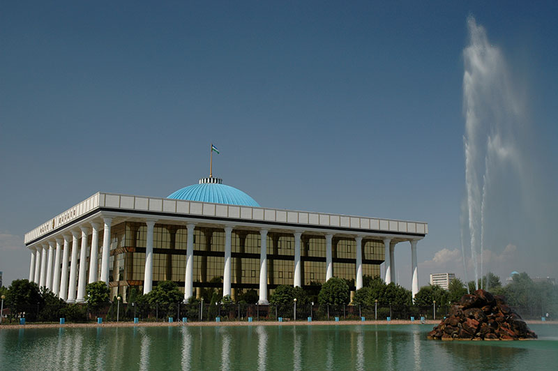 Islam Karimov, Uzbekistan’s despotic president, has a clear wish to homogenise life across Uzbekistan; to impose an unnatural degree of order across the country, which robs many cities of character. At once Tashkent is too large to be robbed of its Soviet character, but simultaneously it is the site of Karimov’s greatest attention, nowhere more so than in Independence Square. Here absolute control and absolute order are manifested in a heavily policed park, whose grass is trimmed by squads of scissor-wielding women, and may not be walked on. A facade of prosperity, of absolute order and calm must be projected to the people, who seem rather out-of-place in this soulless park. Economic stability and reasonable salaries would probably impress people more. I strike west along Uzbekistan Avenue, passing some monumentalist Soviet giants and the nasty smoked-glass Uzbekistan Banking Building, whose pseudo-national style is typical of post independence architecture. From the huge Soviet rotunda of a circus I turn south, reaching the magnificent Palace of Friendship of Peoples, an iconic piece of Soviet Modernism which sits in a large, strangely empty park, backed by what must be some of the longest apartment buildings ever constructed. South from here I venture into Navoiy Park, where the Uzbekistan Parliament Building is one of the few tasteful new buildings, though what use a parliament is in such a dictatorship is highly questionable. From here I take a stroll down Beshagach Street, which runs through Neoclassical columns back to the very centre of the city at Amir Timur (formerly Lenin) Square. Here lies the Hotel Uzbekistan with its mesmerising latticework in the style of Timurid mosaic-work, though I am saddened to see that the ancient plane trees which previously filled the park have been cut down for no apparent reason; a move very unpopular with many of the city’s residents.