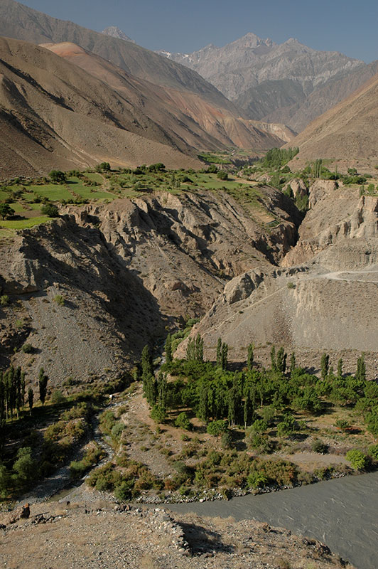 After some poor attempts at extortion on the Tajikistani side of the border, I’m free at midday on the newly built Chinese road which runs first to Khujand, crossing the Syr Darya then heading south past Istaravshan, climbing into the Turkestan Range. As the road climbs steeply, hugging the mountainside, I can see that the Tajiks share the same mindless, belligerent incompetence behind the wheel as their Persian cousins, and the road is lined by the mangled wreckage of lorries which have crashed off a precipice on one of the switchbacks above. The asphalt disappears as I begin the climb of the 3350-metre Shakhristan Pass, which then leads down to the village of Ayni, where after a delicious meal of fatty mutton shashlik, I turn off the main highway onto the rough road above the Zarafshan River.