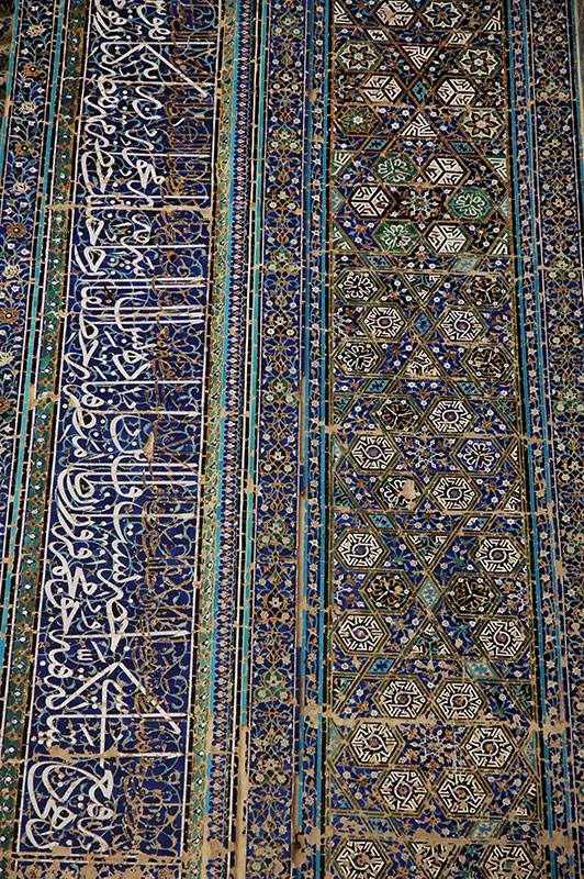 After around thirty kilometres however I turn east, back into the foothills of the Hissars, winding up a narrow valley of powdery orange-brown rocks and scattered mud-brick houses to the large village of Katta Langar, where on a flat-topped hill sits the red-brick mausoleum of the sixteenth century Sheikh Muhammad Sadik. Said to be an adherent of a minor Sufi sect which was pushed into this small valley by the Naqshabandi Order (who spread from Transoxiana to the Indian Subcontinent at around this time), the mausoleum is restrained, lacking the dazzling faïence of the country’s most famous shrines, but of very elegant, Timurid proportions and set amidst a delightful cemetery of pistachio trees and ancient gravestones with Arabic inscriptions. Across the valley, where the bulk of the village houses lie along winding, unpaved alleys, is the Friday Mosque which, while plain on the outside, has a dazzling interior; a floor covered in aged carpets, walls of blue, geometric and floral tiles and a beautiful faïence frieze of Arabic below a decorated wood-beam ceiling supported by finely carved oak pillars. The mosque is said also to date from the sixteenth century – though I wonder how much of what survives is original – and is unusual for reversing the typical combination of exuberant exterior and plain interior.