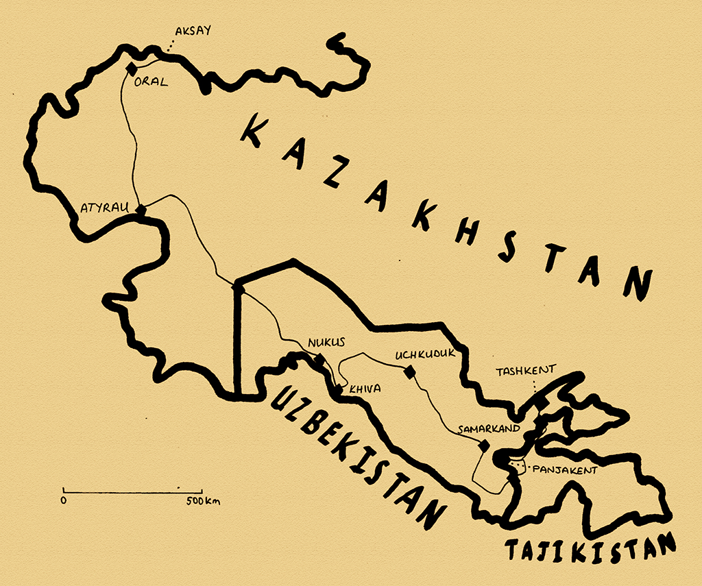 Beyond the checkpoint the road winds down the Mediterranean-like foothills, dotted by the holiday homes of the capital’s rich, into the sweltering heat of Dushanbe. I had planned on spending a couple of days here but, having found the city rather dull on my first visit in 2007, and not wanting to run into my accusers, I bypass the city and head straight for the Uzbekistan border at Dusti. I leave Tajikistan without an issue, and am even given a melon by a customs officer who is a frustrated piano player, and asks me to invite him to the UK. However, here I am once again subject to the bad relations between the two countries, as vehicular traffic is reduced to a trickle through the Uzbek customs yard, with thorough and time-consuming searches. I have to spend the night in no-man’s land, under an old Soviet monument to fraternal relations between Soviet nations; something which seems in short supply here. I do make friends with the only other car driver here, Nazim, a Tajik who is driving to Almaty. When we are finally admitted to the customs yard mid-morning the following day, Nazim is first in, though I need to lend him some tools to start dismantling parts of his engine so that the Uzbek guards can read his engine number. After my own thorough search, I’m through ahead of Nazim and wait for him a short way down the road, taking a very refreshing dip in the cool waters of an irrigation channel. Before long Nazim arrives and we have a great late lunch together, which he insists on paying for, before we go our separate ways.