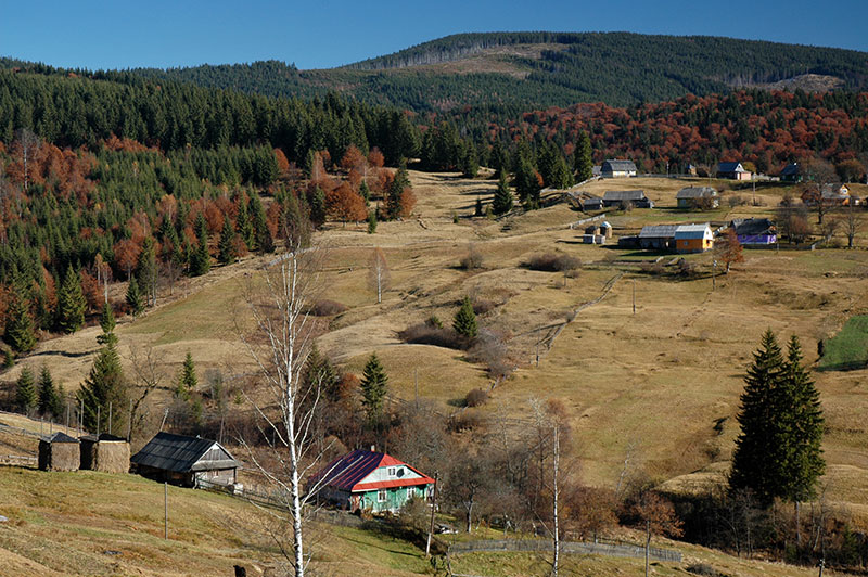 Shortly after turning south from the main road, we begin to climb and thankfully leave behind the fog and grey skies to emerge into radiant autumnal sunshine and gorgeous views of rolling hills, covered in primeval forests of green pines mixed with now-brown beech trees. On grassy hillsides between the stands of forest lie idyllic villages of colourful wooden houses, wicker fences and tall ricks of drying hay; a delightfully bucolic vista of pre-modern Europe. Our climb tops out at a little under one thousand metres at the Vyshkiv Pass, beyond which we descend into Transcarpathia, Ukraine’s most far-flung region.