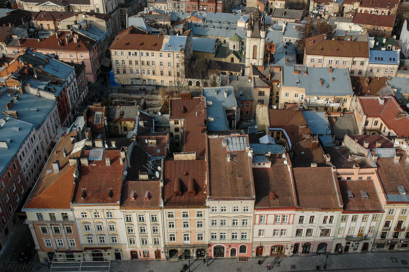 From the top of the sixty-five metre clock tower one has a spectacular view of the old city from its very heart, revealing grandiose Habsburg residences amid rows of three and four storey town houses in pale shades of peach, buff or pink and with sloping red terracotta or grey lead roofs, clustered somewhat haphazardly around small yards. For once, the Soviet urban planners have had the sensitivity to locate their comparatively graceless concrete buildings mostly in the suburbs, preserving the visual character of the city. What is perhaps most delightful are the roofs, belfries and clock towers of the various churches, cathedrals and monasteries which protrude above the roofs in all directions, giving Lviv the feel of a European Samarkand, or a miniature Jerusalem.