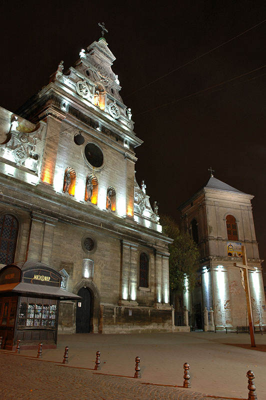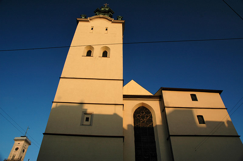 To the north is the distinctive white tambour and conical roof of the Armenian Cathedral, used by the Polish-Armenian community until their expulsion from Ukraine following the Soviet takeover in 1945. To the east lie several churches; the beautiful Baroque sandstone of the Dominican Church, now belonging to the Ukrainian Greek Catholic Church; the Dormition Church, the city’s largest Orthodox Church with its huge, square-plan Gothic Korniakt Tower; the Baroque facade of the seventeenth century Carmelite Church, sitting on an ancient mound a little beyond the centre; the distinctive Church of Poor Clares with its almost Art-Deco features and which is now a sculpture gallery, and the patinated green dome of the seventeenth century Bernadine Church and Monastery. Immediately to the south-west is the imposing Baroque of the fourteenth century Latin Cathedral belonging to the Roman Catholics, next to which is the unusual Boim Family Chapel, built in the seventeenth century by a Lviv merchant in the Italian Renaissance style, but with an unusual two-tiered carving of religious figures in blackened sandstone, rather reminiscent of an Indian temple. Due west of the square is the newly restored Jesuit Church, dating to the seventeenth century and once one of the largest churches of the Polish-Lithuanian Commonwealth, and finally to the north-west the Church of the Transfiguration, neatly slotted into a city street and also now also belonging to the Ukrainian Greek Orthodox Church.