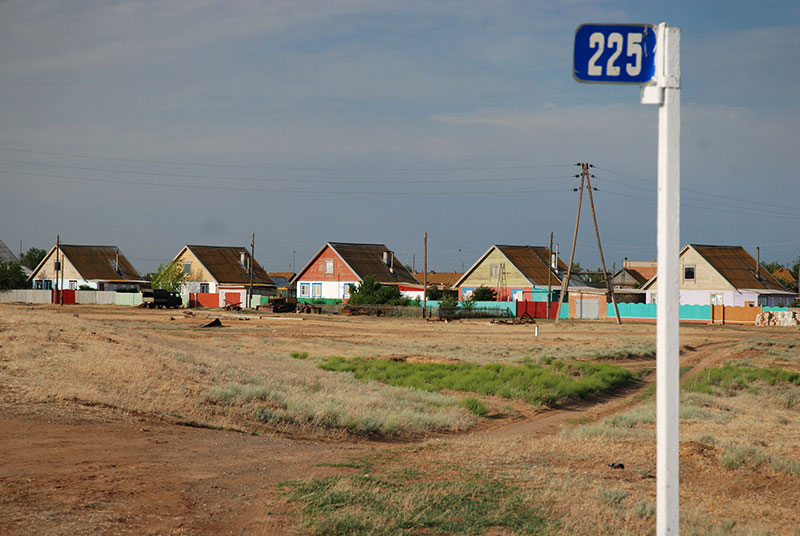 After following the Akhtuba for more than four hundred kilometres, I touch the very outskirts of Astrakhan and turn east, crossing a number of minor Volga distributaries, with the very last of these, the Kigach, forming the border with Kazakhstan. The border crossing is straightforward though tedious in the sweltering heat and amid swarms of blackfly, though by early afternoon I’m on the appallingly potholed road east towards the city of Atyrau. Outside the small town of Ganyushkino I stop to watch some cows wading in a pond next to the road, lazily grazing at the thick layer of water lilies on the surface, only to attract the attention of two young Kazakh men lying on the grass nearby. One starts to shout in a way which seems somewhat aggressive, though it is clear he is extremely drunk and, as he fumbles to put on his trousers, collapses into a deep muddy puddle, much to my amusement.
