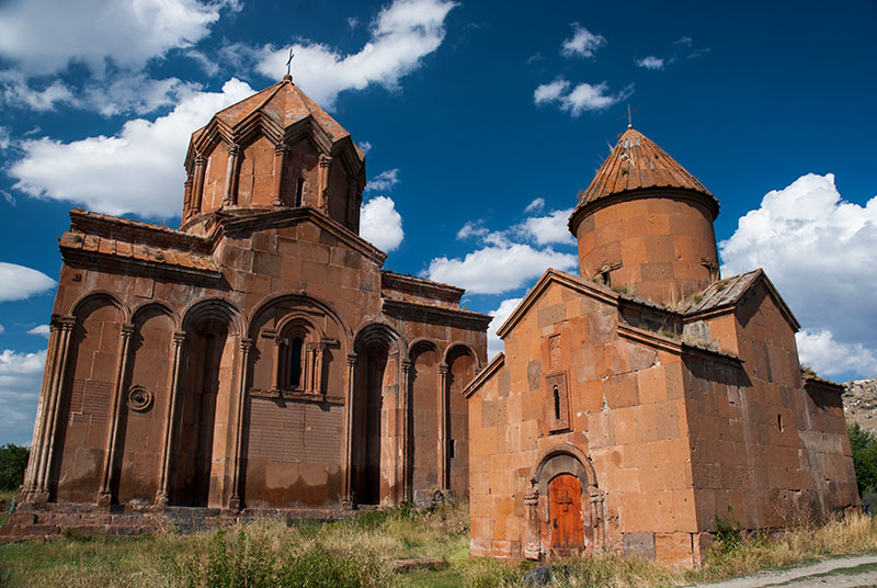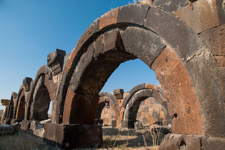 There is however a beautiful monument of the Silk Road, a branch of which would have passed through Ani and into modern Armenia, in the form of the eleventh to twelfth century Jrapi Caravanserai; a long, low building missing much of its roof, revealing attractive, heavy arches of pink and black tuff. A little further south, in the pumice-mining village of Anipemza one finds the remains of the huge, fourth to sixth century Yererouk Basilica, one of the earliest extant examples of Armenian architecture. Yererouk is of importance not just for its great age and size, but also for the Greco-Roman influence which can be seen in the five-stepped plinth on which it sits, and the columns and pediments of its entrance portals, giving an insight into the form of early eastern Christian architecture.