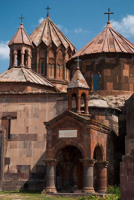 In the nearby village of Harich, I drive up between simple farmhouses to the striking Harichavank Monastery whose main building is an amalgamation of seventh and thirteenth century churches, the latter having a very fine sixteen-sided tambour and faceted umbrella dome, representative of a golden age of monastery building in Armenia. The monastery has a nice, lively atmosphere with a large family group celebrating a baptism service, picnicking in the monastery’s grassy grounds. Walking inside, I catch the end of the service, which seems to be a joyful event with none of the stiffness I had noticed in Georgian church services.
