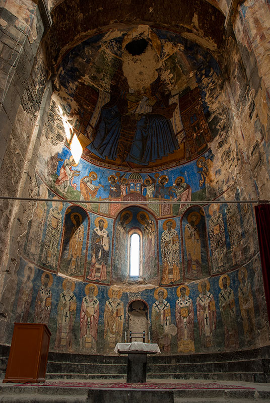 Beyond Alaverdi, heading once more east, I make two side trips; first to Haghpat Monastery, set on a grassy hillside and similar in age and style to Sanahin with very finely carved khachkars but also with a distinctive thirteenth century bell tower. The second is Akhtala Monastery, situated within the ruins of a tenth century fortress overlooking the road as it begins to loop northwards towards the Georgian border. Akhtala’s Mother of God Church, which has lost its dome, is a thirteenth century basilica and was in fact built as a Georgian church. I speak to a nearby shopkeeper who is also the key-holder to the church, and he admits me into the interior where magnificent frescoes cover many of the interior walls; most impressively in the apse where a defaced Virgin Mary sits enthroned above rows of saints.