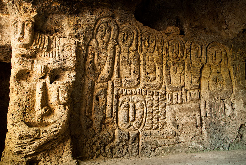 Rejoining the main road heading southwards and turning off at the edge of the town of Ijevan, I climb into the hills and park the truck at the edge of a holiday resort which marks the end of the track. I walk into thick, beautiful woodland of oak and hornbeam, dropping after some time into the gorge of the Sarnajur River, which has been carved out of the native limestone. Here one finds a series of natural caves, said to have been inhabited in ancient times and a place of refuge during the Mongol invasions. One of these, known as the Anapat Cave, is richly carved; most strikingly with a large mask-like face which looks almost pre-Columbian American in style, with six human figures standing next to it. Crosses are found carved elsewhere in the cave, but the mysterious portraits are allegedly pre-Christian.