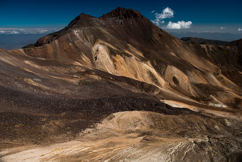 In the morning I leave the truck on the mountainside and walk up to the southern summit which at 3888 metres altitude is the lowest and also most accessible of the mountain’s four summits. Ever visible, off to the south are the two peaks of Greater and Lesser Ararat, respectively eighty eight and ninety six kilometres away, in Turkey. The two peaks of this highly prominent, dormant volcano are deeply ingrained in the Armenian soul. For much of history they were the symbol of Armenia (they are even pictured in profile on the entry stamp to Armenia made in my passport), yet for generations they have hovered in the Armenian consciousness as a painful reminder of their tragic history, just as they now hover mirage-like in the haze, tantalisingly out of reach across a sealed border. In less than two hours I am on top of the south summit, looking across a yawning caldera of craggy, beige and chocolate-brown rock, which I have all to myself until the arrival of a somewhat elderly German tour group.