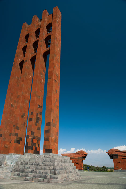 I drive west out of Yervandashat passing the abandoned spur of a highway which in better times would lead to a border crossing with Turkey. Soon villages start to appear more frequently as I enter the irrigated lowlands which spread all the way to the capital. I stop at the Sardarapat Memorial, a striking fusion of Armenian red tuff and Soviet brutalist styles with winged oxen and a thirty-five metre bell tower inspired by medieval Armenian memorial stelae. The monument was constructed in 1968 on the fiftieth anniversary of the Battle of Sardarapat, which saw scant Armenian forces fight off the Ottomans, who in May 1918 were sweeping towards Yerevan following the withdrawal of Bolshevik forces from the region. Given that this was just three years after the Armenian Genocide, when Armenians had been effectively exterminated from many of their ancestral lands, a victory here for the Turks could have put an end to the Armenian state altogether, and thus the victorious battle is commemorated as having saved Armenia from being relegated to history books.