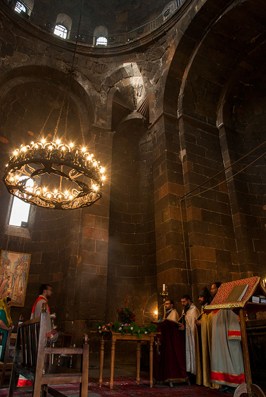 More interesting to me is the nearby seventh century Saint Hripsime Church, an elegant cross church which vies with Georgia’s Jvari Monastery as the archetype for this uniquely Caucasian evolution of Byzantine design. Karine and I enter whilst a service is going on; a robed priest is giving a sermon whilst an acolyte swings a thurible, filling the air of the church’s brooding stone interior with fragrant incense. Once again I notice a rather light-hearted air in the church, with the priest and congregation laughing as a particularly dense billow of smoke engulfs the priest, momentarily interrupting him.