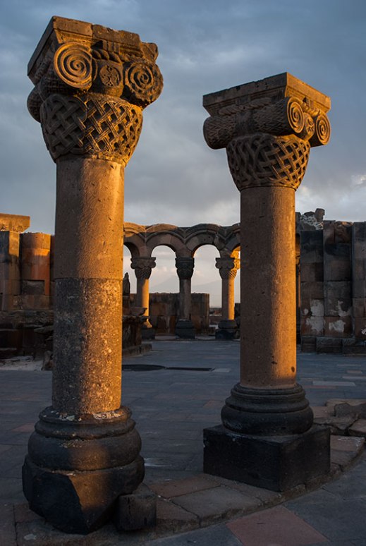 In the evening Karine and I drive out to the ruins of the seventh century Cathedral of Zvartnots, whose original form is unknown, beyond the ground floor of a tetraconch surrounded by a thirty-two sided gallery, which would have looked circular. Some historians reconstruct it with three concentric tiers, like a miniature Tower of Babel, though this would have made it one of the most technologically advanced structures of its day, and might be aggrandised by the Armenian’s great pride in their own history. Whatever the reality, the rotunda of partially intact arcades on Greco-Roman pillars are quite a doleful sight as they catch the last rays of red sunlight lancing through the stormy grey sky.