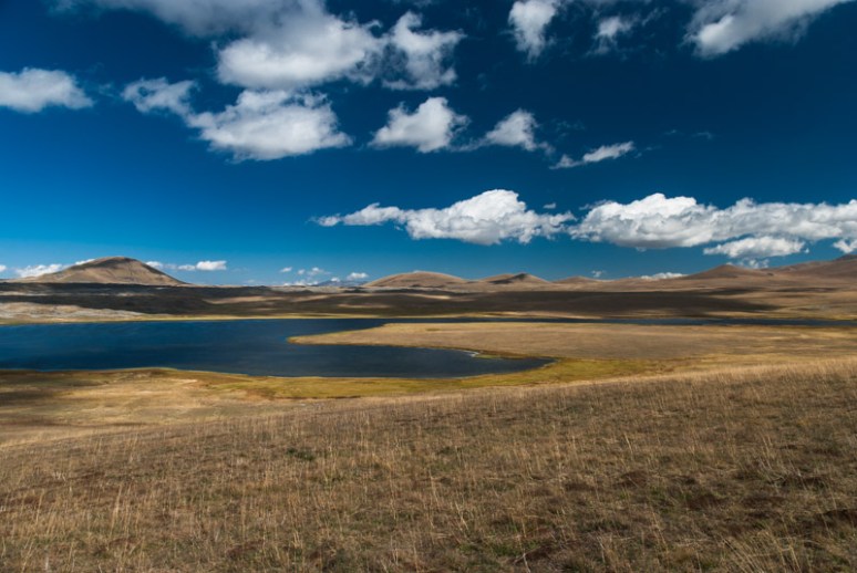 As I leave the village, I see an old Azerbaijani cemetery on the grassy hills; tall stones beautifully carved with Arabic script against a stunning mountainous backdrop, which although wonderfully tranquil is equally tragic given that the community has long since fled. The track I’m on is very seldom used – little more that flattened grass – and the only vehicles I see are a group of Soviet ZiL trucks which men are filling with cut grass, in preparation for the impeding winter. After some steep climbing I reach a wide, rolling plateau at an altitude of around 2700 metres, and just over two hours after leaving Tsar I catch the first glimpse of the magnificent Al Lakes; first Little Al then Big Al Lake, with a backdrop of the volcanic highlands on the Armenian border, below which is a dark, hardened lava flow reaching to the far shore of the lakes. It’s a magnificent spot, with just a few shepherds in Soviet UAZ vans and a camp of grass-cutters in an otherwise untouched wilderness. There are no signs of any tourists or their litter, and I have the satisfaction to have visited a truly remote area which I have never read anything about, but which has merely caught my eye when perusing satellite imagery of the region.