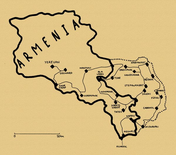 After a side trip to the impressively located, fortified Tatev Monastery, which overlooks the yawning Vorotan Valley, I return to Nagorno Karabakh, using the ‘official’ border crossing at Aghavno. The road is in near perfect condition, far better than any other I have seen in Armenia, and leads through the Lachin Corridor, another swathe of occupied Azerbaijan, crossing successive ridges and pleasant small towns and villages, before climbing into Nagorno Karabakh proper. Just after sunset I reach the capital, Stepanakert, and I meet my local contact Marut, who helps me find a homestay run by a very kind Armenian family who ply guests with excellent food and endless coffee and sweets.