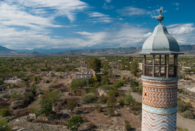 Heading steadily south, I pass a few ruins; a collapsing memorial to the Great Patriotic War (there seems some rather idiotic irony to a memorial dedicated to an earlier war damaged and neglected due to a subsequent war), an octagonal Muslim tomb and wrecked vehicles, and then Shahbulag Castle, an eighteenth century stronghold also built by the Khans of Karabakh. The road then reaches an intersection; the asphalt veers to the right, back towards Askeran and Stepanakert, but I continue straight to the destroyed city of Ağdam. I am worried to pass a rambling army base just north of the former city, but all I get is friendly waves from bored-looking conscripts and so I continue, bearing for the twin minarets of Ağdam’s nineteenth century mosque, built by the same architect as the two Govhar Agha Mosques in Shushi. I climb the eastern minaret to the upper balcony where once the muezzin would have called the azan. I’m surrounded by quite a moving scene; an entire city systematically destroyed, building-by-building, leaving only piles of rubble, disconnected patches of asphalt and mature trees gradually taking over the old city layout. All the colour of life has left the city – aside from the red, buff and blue of the minaret’s tilework – leaving a doleful monochrome. A plaque outside the mosque simply names it a ‘Persian Mosque’.