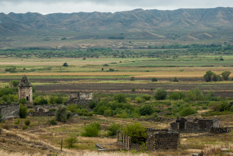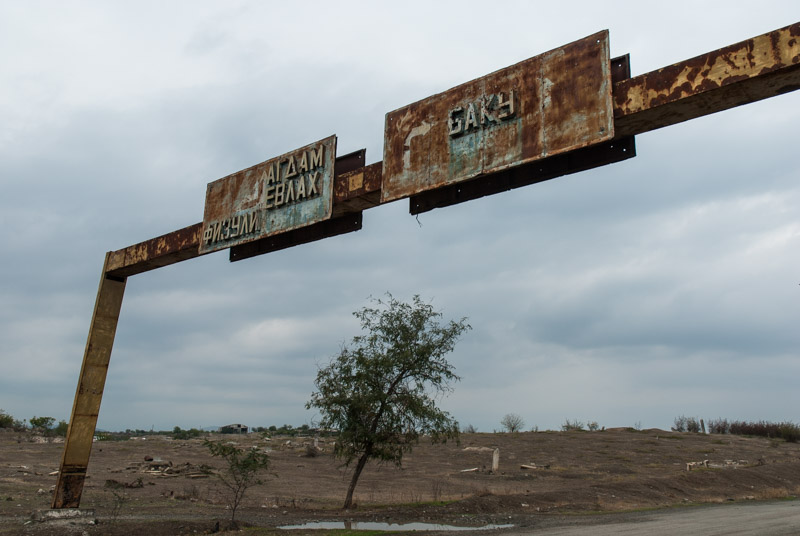 Amaras is unprepossessing to look at, but has quite some history; said to have been founded originally in the fourth century by St Gregory the Illuminator, patron saint of the Armenian Apostolic Church. It is also said that Mesrop Mashtots established the first school to use his Armenian alphabet in Amaras. The monastery came to be abandoned and by the early eighteenth century was used as a Russian frontier post, and I assume that the formidable stone defensive walls date from this period. The monastery was reclaimed by the Church in the middle of the nineteenth century and the monastery’s sole church dates from this period, its walls now pocked with bullet marks from the recent war. I speak to a gentleman living in a home atop the monastery walls, who offers me lunch and points the way to what used to be the town of Füzuli, across the rolling fields, which he reassures me are free of land mines. It’s a nice drive across the fields, aside from the sight of yet more destroyed villages, but Füzuli has suffered the same fate as Ağdam; scorched earth and rubble, with even the cemetery appearing vandalised, the city unpopulated apart from the odd squatter or shepherd. On the southern edge of town I find a rusted gantry across the road with Soviet-era road signs, which I find highly poignant, for the destinations – Baku, Yevlakh, Ağdam, Füzuli – are either in unreachable Azerbaijan, or literally wiped off the map.