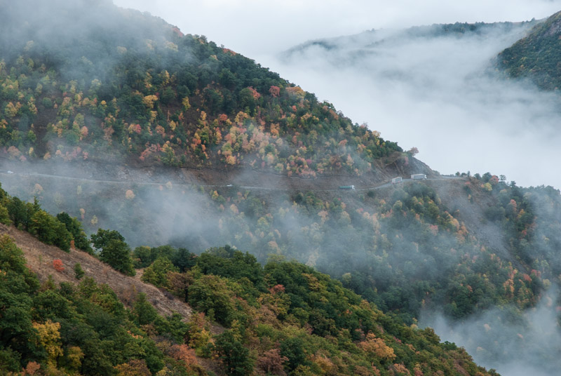 Across the Akari, an Armenian population begins to slowly reappear and the land comes falteringly back to life. It’s late morning by the time I reach the town of Mijnavan (Minjavan), with a beautiful main street of mature plane trees masking the squalor and dereliction of the buildings behind. I could return to Armenia along the Aras Valley, heading straight towards Meghri and the Iranian border crossing, but chose to head north, through the ruins of Kovsakan (Zangilan) and along a valley of misty limestone cliffs. I cross back into Armenia at a point near a rubbish dump which is wholly undemarcated, and without any official presence, and slip back onto the Yerevan – Meghri Highway in the town of Syunik, as if I had never been nosing around in the forbidden frontier of Nagorno Karabakh. I stop in the damp and rather dour mountain town of Kapan to eat and change some money, then continue south through filthy mining towns and on through the beautifully forested Zangezur Mountains, which are just starting to turn to autumn colour. The road is slow, choked with Iranian trucks bringing goods into this isolated mountain country and badly driven Iranian cars weaving in and out amongst them, but it’s also highly scenic and I’m content at having seen a good swathe of Nagorno Karabakh without getting into trouble.
