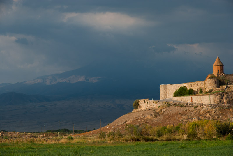 It’s late afternoon when I leave Garni and I make the mistake of taking the old Yerevan ring-road, which leads through a foul, sprawling, informal rubbish dump covering a hillside beyond the eastern edge of the capital. Shortly beyond, the land has subsided so dramatically that the asphalt has broken up like pack ice; in places, islands of asphalt have totally detached from the road, and skeletons of old houses lean at impossible angles. I finally emerge somewhere near Masis onto the main Yerevan – Meghri Highway, which is being reconstructed and is heavily policed, despite the absence of any road signs. The area is heavily polluted with factories spewing smoke into the air (conveniently close to the Turkish border) and I am glad to turn off the highway after dark and stop for the night in a field just a few hundred metres short of the Aras River, which here marks the Turkish border. I enjoy a cold Kilikia beer in the truck as lightning flashes in the clouds above me. I am just below the seventeenth century monastery of Khor Virap, at the point which is as close as one can get to Mount Ararat – the national symbol of Armenia now – without leaving present-day Armenian soil.