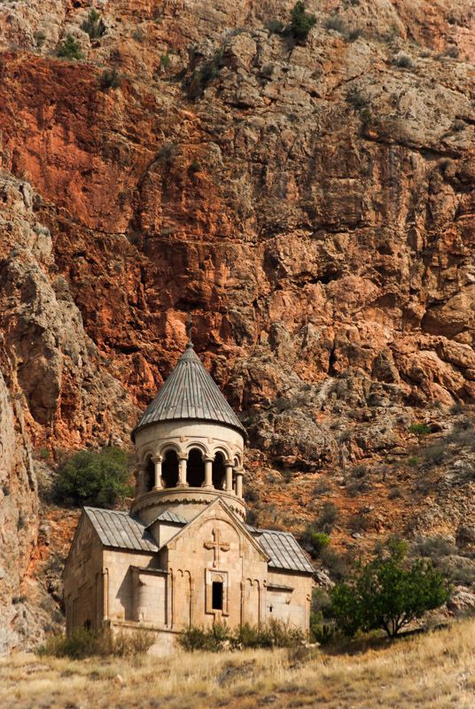 In the morning the view is disappointing; clouds, haze and smog (from the Armenian side) mean that the huge mass of Mount Ararat sits almost invisibly across the frontier. I can’t bring myself to visit the monastery, and so resume my journey, almost as far as the border with Nakhchivan where I had been six weeks earlier. The road then leaves the Aras Valley and climbs towards the mountainous south of Armenia. Dropping into the Arpa Valley, I take a side road and climb up to Noravank Monastery. Despite having had my fill of churches I am genuinely impressed by those of Noravank which have perhaps the most dramatic location of any I have seen in Armenia, sitting below a sheer cliff of flaming red rock. The churches which make up the monastery are also highly notable, with the beautiful, fourteenth century Surb Astvatsatsin Church having an an unusual and intricate colonnaded tambour (drum) and the thirteenth century Surb Karapet Church having carvings of the Holy Mother with Child, and of God the Father, whose beard contains a small bird, and who holds the head of John the Baptist in hand, with a dove (the Holy Spirit) above it.