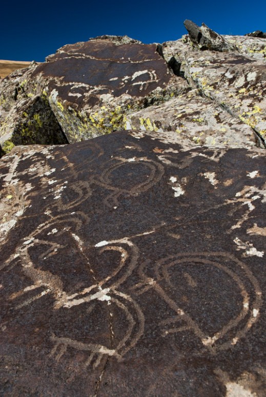 Next day, from further east along the main highway, I climb into the mountains once again, back towards the border with Nagorno Karabakh. I take a wrong turn early on, and spend a couple of hours driving aimlessly across steep hillsides, but after considerable frustration retrace my steps and find the correct path, climbing steeply towards the prominent Ughtasar Mountains. After one unnervingly steep ascent on a loose gravelly track, with hair-raising drop-offs on either side, I reach the Ughtasar Petroglyphs at 3300 metres above sea level, which once again I can savour in complete, glorious solitude. The petroglyphs are well worth the trouble taken to reach them; over a wide area, on large, smooth, naturally varnished volcanic rocks are hundreds of pictograms thought to span thousands of years. Many are of long-horned goats, but there also human figures hunting on horseback with bow and arrow, and a beautiful twin ox-plough. There are also more esoteric geometrical patterns and what may be shamanistic symbols, once again impressing me what seems to be a running theme in Bronze Age rock art spanning much of Eurasia.