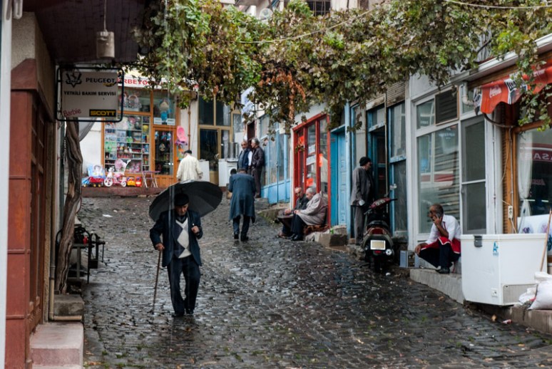 Down in the town centre I am further delighted by a compact bazaar with cobblestone streets strung with vines. Despite the pouring rain there is plenty of activity in town, with men standing in doorways and under roof eaves chatting and smoking. Women are also far more prominent than in the towns of the east, usually uncovered, out having tea together in restaurants, driving cars and shopping. Divriği feels to me like my first real Turkish town, here in the mountains of Anatolia.