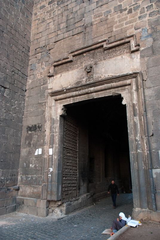 I spend the whole of the following day with Ferhat exploring Diyarbakır, which feels slightly calmer in daylight. I’m drawn to the Old City, which is surrounded by imposing black basalt walls several kilometres in length and largely intact, making Diyarbakır a rare example of a preserved, walled medieval city. In a central street, lined by khans and ancient shopping arcades, is a central square where men sit at small tables drinking tea and playing backgammon. Much of the central city architecture consists of black-white banded architecture reminiscent of Umayyad architecture of the Middle East. The eleventh century Grand Mosque, which sits behind the square, is an eleventh century Seljuk structure executed in black basalt, but incorporates two tiers of arcaded Corinthian columns taken from an earlier Roman theatre during a twelfth century reconstruction, which reminds me somewhat of the Grand Mosque of Damascus.