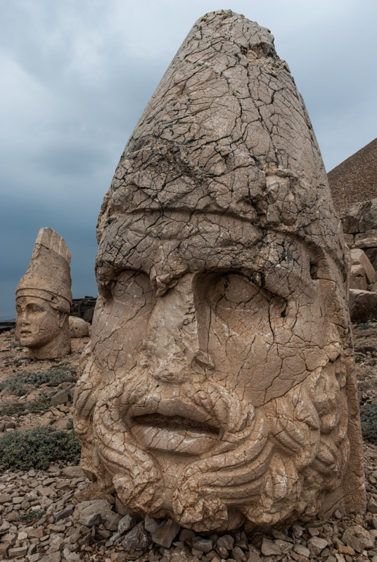 Back in 2003 I had wanted to visit Mount Nemrut, but being without my own transport and failing to find any other travellers in the fly-blown town of Kâhta with which to split the cost of a tour to the summit, I left disappointed. Today the weather is bad, but I fulfil this frustrated ambition from eleven years ago, driving myself up a paved road to a large car park at around two thousand metres elevation. It’s out of season and I have the site almost to myself, which certainly makes up for the overcast weather. After a short walk, one reaches the ruins of King Antiochus’ sanctuary, surrounding a scree-covered summit which is thought to cover his tomb. The statues must have been a stunning sight when complete, but at some point in history unknown iconoclastic zealots have systematically beheaded them, leaving the heads surreally detached on the stony mountain slopes. Nevertheless, the carved features of the heads remain well preserved and show figures representing Greek, Armenian and Persian mythology; Heracles (Hercules), Apollo, Zeus-Oromasdes (a Greek-Armenian hybrid); Persian-style eagles and lions, Tyche, the goddess of Commagene and of course Antiochus I Theos himself.