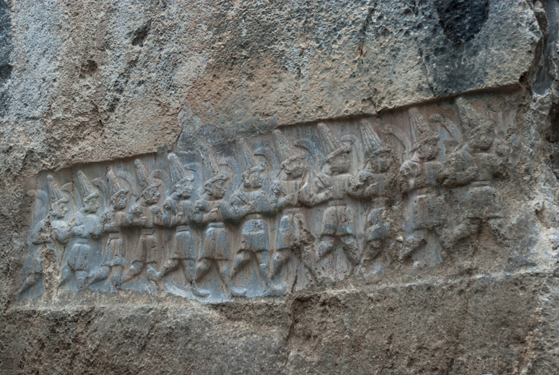 I start the day in the Hittite sanctuary known in Turkish as Yazılıkaya, where in a small rocky canyon at knee-height, two thirteenth century BCE friezes depict processions of deities in distinctive Hittite dress; males deities on one side in short skirts, pointed shoes and tall, horned hats and females on the other in long skirts, wearing crowns. Beyond the friezes are further, better preserved carvings showing twelve gods of the Underworld; an odd, armless representation of the god Nergal from the Babylonian pantheon who is mentioned in the Old Testament, and a carving of the god Sharruma (borrowed from the Hurrian pantheon) and Hittite King Tudhaliya IV who may have been be buried here.