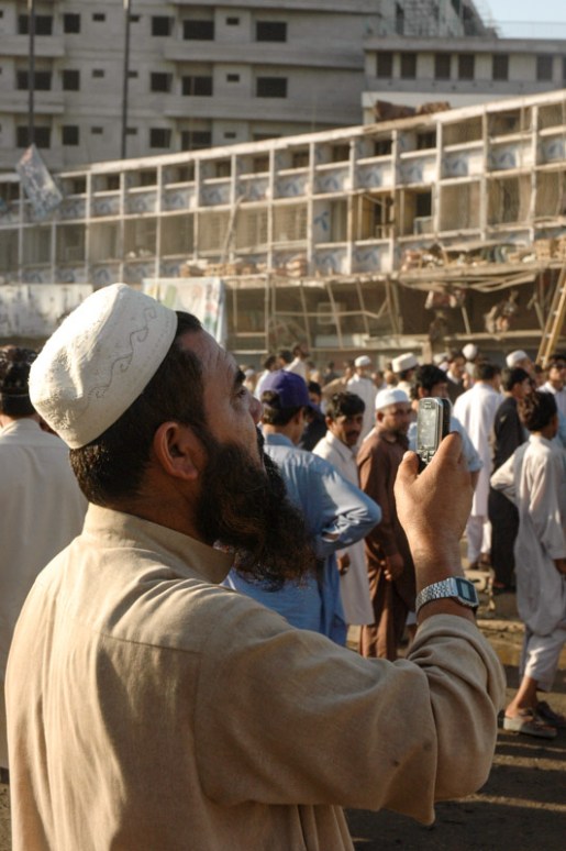 I arrive early in the hotel, where I meet Keith, one of those unashamedly eccentric characters one seems only to meet when travelling. Tall and well-built, loud and flamboyant, Keith, half Geordie and half Turkish has long, flowing hennaed hair and wears an Egyptian jellabiya which stands out from the ubiquitous shalwaar kameez of Pakistan. Keith had been teaching music in Lahore, where I had initially met him last year, and on joining him for dinner one evening had realised that he seemed to be on very good terms with most of the young men in the neighbourhood. I meet Keith this time fleeing the lobby of the Rose Hotel, chased by a young man brandishing a cane, whom he had presumably fondled. He wouldn’t be out of place as a character in a Graham Greene novel. Being just outside the bomb site, Keith had gone out and immediately witnessed the aftermath, and was shocked not only by the carnage and gore, but at the reactions of the local people, walking around casually taking photographs of the dead and dying as if it were some kind of art installation. It seems that one can remarkably quickly become desensitised to appalling violence.