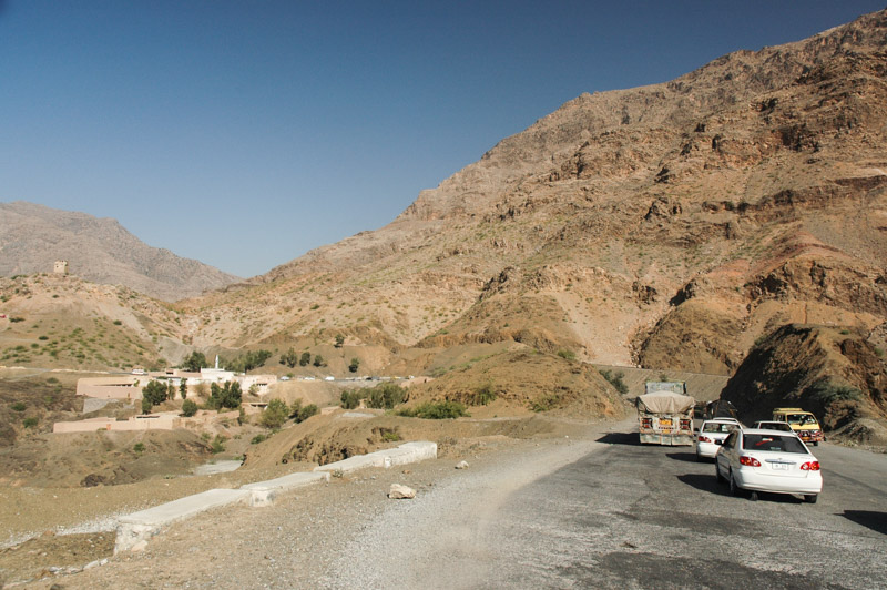 The scenery is epic and truly takes me by surprise, twisting through river beds and across wide plains with distant mountain vistas, over gravel plains with isolated yet pleasant-looking villages, whose existence is evidenced by the greenery surrounding them. Eventually, an immense valley opens up along a twist of the river, with mountains plunging over one thousand metres to the valley bottom. On one ridge sits what looks from a distance to be a fine Tibetan-style fort, but turns out to be a Frontier Corps stronghold, still in active use. The road then descends into a stupendous gorge so deep and narrow that the sun is completely blocked out, and the road hacked from right out of the mountainside. The area has the grandeur of parts of the Karakoram Highway, albeit without the snowcapped peaks and apricot orchards. Once through the gorge, the land starts to soften, and the bleak, beautiful aspect of the mountains submits to the pale skies and vegetation of South Asia. Scrubby plants start to appear on thin soils, and small villages become more frequent as the road descends around the last ridges, down onto the plains of the Northwest Frontier.