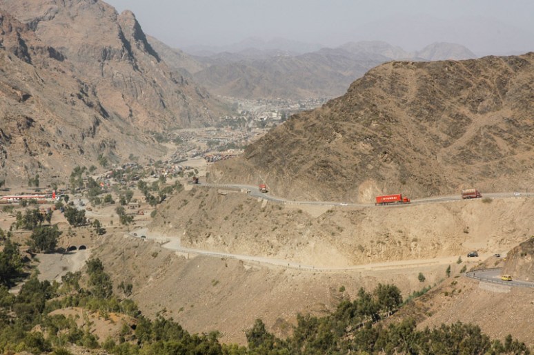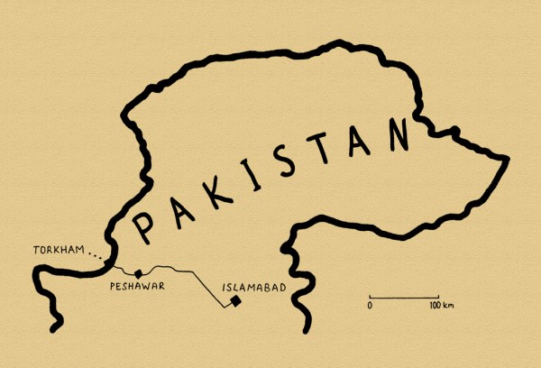 Shortly after, I pass the huge, fortified complex of drug-warlord Ayub Afridi – Asia’s Pablo Escobar – who lives a life of vast wealth derived from drug-trafficking (it’s widely rumoured that the CIA used Afridi’s network to supply money and arms to the Mujaheddin in the 1980s), wholly unmolested by any authority. I pass through the wild-looking town of Landi Kotal, which looks to have been built specifically to withstand a siege, and shortly after, the road turns at Michni Post where the land rolls away steeply to reveal a narrow valley choked with lorries and other indiscernible chaos in the hazy distance. This sprawl is the cross-border town of Torkham. I have crossed the Khyber Pass.
