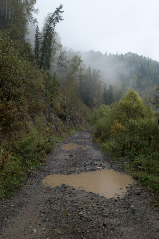 After topping up with fuel in Mezhdurechensk, we cross the Tom on a narrow pontoon bridge in the village of Mayzas, where I stop to ask a man fixing a lorry at the roadside, who confirms that the road is passable in a 4×4. Encouraged by this news, we head up into the mountains on an excellent, recently graded track with occasional glimpses across a cloud smeared, rolling wilderness of taiga, crossing a pass of around one thousand metres and descending to the village of Orton.