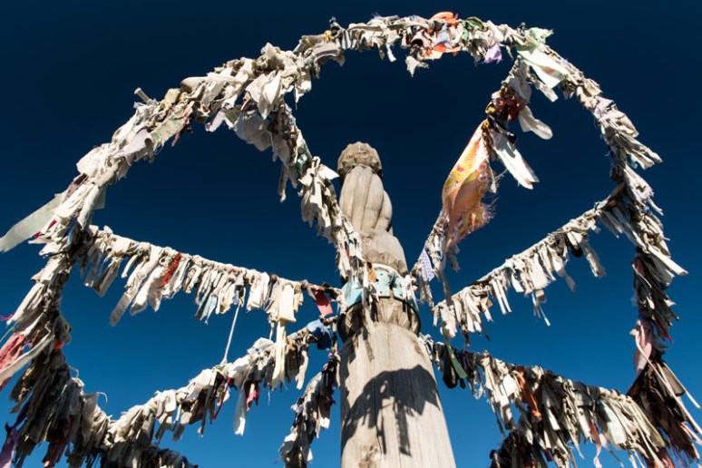 The Buryats are the major northern sub-group of the Mongols who inhabit the forested valleys east and west of Lake Baikal. Traditionally shamanistic, Buddhism spread among the Buryats from Mongolia in the seventeenth and eighteenth centuries, though it often came to coexist with, rather than replace, shamanistic beliefs. Russia formally annexed these territories in the seventeenth century, but it was only in Soviet times that the Buryats and their culture were repressed. Under Stalin tens of thousands of Buryats were murdered in an uprising against collectivisation and by the end of the 1930s the majority of monasteries had been closed and destroyed and the clergy murdered. Buryats to the west of Baikal have been strongly Russified, with some becoming Christians, but here, in the beautiful valleys beyond the lake’s eastern shore, the old traditions are slowly returning. Shuluta’s original datsan has survived Stalin’s Great Purge, though it is a formless shell awaiting restoration, but on a rise above it sits a beautiful, modern wooden temple, built in the Tibetan style and surrounded by a wooden fence hung with fluttering prayer flags. Just next to the temple is an unusual construction of multiple poplar sticks arrayed in a cross; a newly built ovoo hung with prayer rags in offering to the spirits that inhabit the place. There’s little activity in the temple, but we get chatting to a Buryat carpenter who tells us a little about the place, then takes Maciej’s palm and reads his fortune.