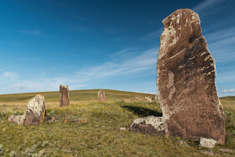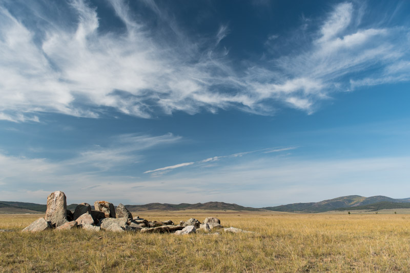 In the small, friendly town of Askiz we reach the A161 and turn south towards Tuva and the Mongolian border. The road follows the Abakan River through more beautiful, watered grasslands with occasional poplar trees dotting the river, and mixed villages of Russians and Khakass. In the late Bronze Age, pastoralist cultures of the Eurasian Steppe such as the Tagar came to be replaced by nomadic horse-men, ushering in a period in Eurasian history of nomadic invasions into ancient centres of settled civilisation; the Xiongnu into China, the Saka into Iran and the Huns into Rome. Here in Khakassia, the Tagars were displaced in around the third century CE by the Yenisei Kyrgyz or Khyagas; Turkic nomads, many of whom would migrate south to become modern Kyrgyz and whose local descendants are known today as the Khakass. We turn off the highway in the late afternoon and drive into the hills immediately above the village of Safronov, camping in an enchanting landscape of rolling grassland hills, backed by low mountains darkened by pine forest. After a beautifully tranquil night, we descend to Safronov’s menhirs; some of the largest in situ menhirs in the region. There are four distinct square-plan complexes, one with a single stone almost five metres in height, richly carved with Iron Age petroglyphs depicting human figures, shamanistic symbols and tribal tamgas. Their silent power, the weight of history which they represent, and their location out in this wonderful, soft landscape, with no fences or even signposts, makes them one of my favourite archaeological sites.