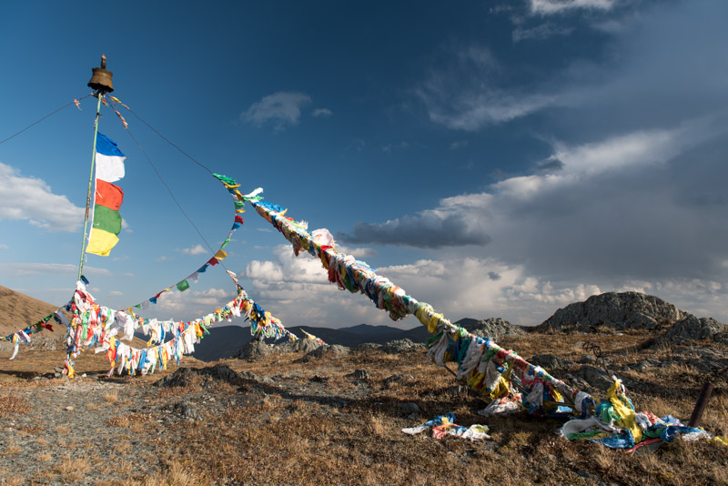 Rejoining the main road, we continue south, with the looming ridges of the Western Sayan Mountains rising on the horizon. We leave the grasslands and enter thickly forested mountains, stopping in the iron-mining town of Abaza to stock up on supplies, then climbing on the almost eerily quiet A161, passing the treeline and stopping on the 2207 m Sayan Pass, the border with the Republic of Tuva. A huge ovoo occupies the roadside on top of the pass; a central mast held by guy cables covered with Buddhist prayer flags which flap furiously in the strong wind. Beyond, darkened in the shadow of brooding clouds are the dark ridges of Tuva, a severely beautiful landscape and a place which fills me with both excitement and a a touch of terror. Back in 2007, on my very first trip to Russia I had entered Tuva on the glorious but tough off-road route from the Altai Republic and found Tuvans with whom I interacted in the west of the republic to be cold, hostile, drunk, aggressive and ultimately violent, leading to two young men attempting to mug me and hurling an apple-sized rock at my truck. Aside from the breathtaking scenery I came away from Tuva with rather negative impressions and so now, looking down once more to the wilds of western Tuva, I am nervous about our safety, but also anxious to have more positive impressions on this second visit.