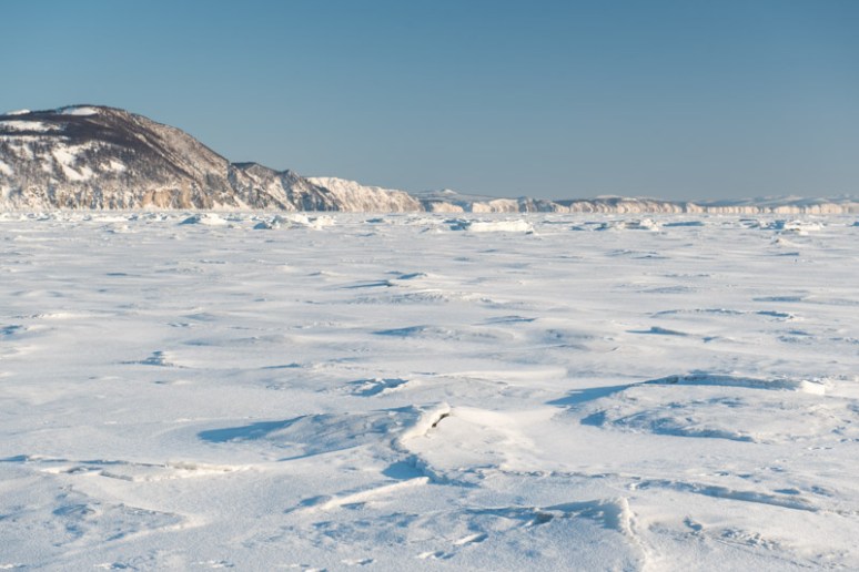 I spend a week in Magadan doing some final preparations on the car; blanking off the radiator with insulation, buying an engine blanket and fitting a second windscreen which I had ordered last October. Oleg helps me greatly in finding everything I need and in offering advice on my preparations. I make the first drive of the year with Oleg, out of the covered parking lot into town, then out onto the frozen surface of the Sea of Okhotsk in Gertner Bay on the city’s eastern edge. It’s an odd sensation to be driving on the sea, over a series of pressure ridges near the shore and out onto unbroken salt-water ice, which I find has a strange roughness to it. Despite being illegal, the sea surface is busy with local ice-fishermen and their four-wheel drives, though every year cars are lost from falling through thin ice. I stock up with supplies, including a number of Russian Army food ration packs which Oleg recommends, fill up with fuel, then put the car back into the covered car park while I make a week-long side-trip.