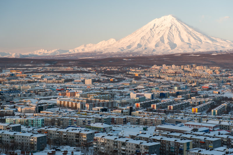 Normally, I would never entertain the idea of flying to a new destination, but I make an exception in order to pay a winter visit to Kamchatka, boarding a turboprop flight to Petropavlovsk-Kamchatsky. I am greeted by low clouds, wind and warm temperatures hovering very close to 0º C making the rather charmless modernity of Petropavlovsk look no different from a suburb of Moscow. A large winter cyclone is responsible for the foul weather, though it is still thrilling to stand truly on the eastern edge of Eurasia, looking out to the Pacific Ocean. Only when the cloud lifts one afternoon am I greeted with a magnificent view over the city to the dramatic, snow-covered volcanoes Koryaksky and Avachinsky whose fluted, gleaming flanks make the place seem suddenly exotic. Although I manage to make a trip to a nearby husky camp, and sit outdoors in a natural hot spring while the worst of the cyclone wind blows overhead, the weather precludes any exploration of the peninsula and I am keen to return to Magadan and start the drive west. My flight to Magadan is however cancelled, meaning I have to make a spontaneous detour to Khabarovsk. The upshot of this is that I am kindly offered a place to stay by Semyon and Nastya, whom Maciej and I had stayed with last year on the outward journey to Magadan, and with whom I spend another lovely evening eating and drinking at the kitchen table.