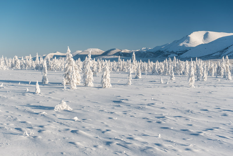 I leave Oymyakon early in the morning and drive in the dark back to Tomtor, with the sun rising to reveal another clear day with stupendous views through the still but dazzling landscape, with sweeping views over endless forested ridges of utter wilderness. Rejoining the modern highway I climb gently through the upland which separates the Chersky Range in the east and the Verkhoyansk Range to the west. The views here are again magnificent with a broad valley of wind-sculpted snow dotted with trees wholly frozen in place by a thick coating of snow, backed by gorgeous, sculpted peaks whose ridges gleam in the late afternoon light. Crossing a gentle pass I descend along the Vostochnaya Khandyga River, entering frozen lowlands where the temperature drops to -40º C and the world is ethereally still, each shape picked out in sharp detail as far as the eye can see in the absolutely dry air. At these temperatures I can feel the car’s brake and clutch pedals stiffen as the hydraulic fluid thickens, but there is otherwise no noticeable change in how it runs.