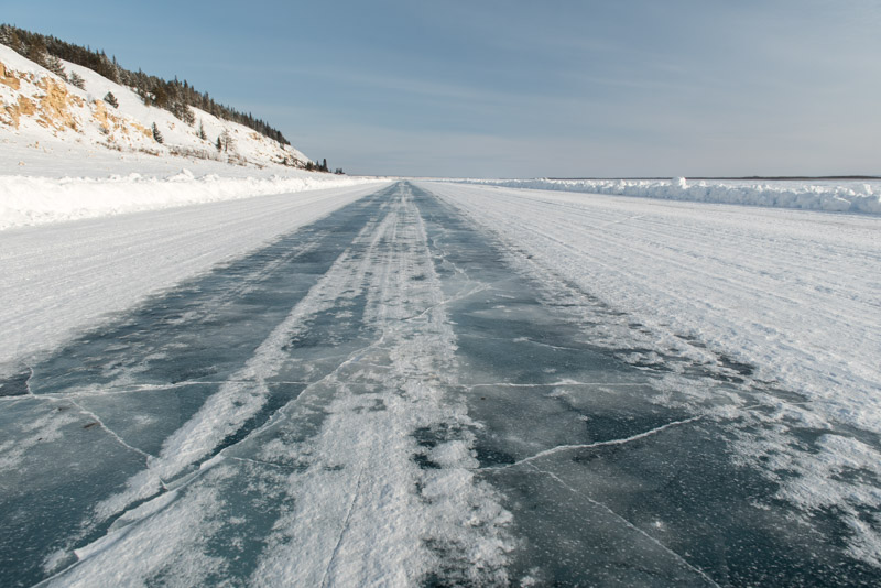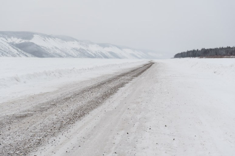 Together we race and dig our cars through the thickest of the snow and onto the ice road which is the worst I have yet seen; the ice has heaved up onto the river’s left bank and the dangerous camber means I slide off into the large snow bank countless times. The river has narrowed here and we pass tall sandstone cliffs dotted with pines, which funnel the wind down along the ice road. Eventually I get the knack of driving; each time I feel the tail of the car beginning to break free I drop a gear and jab the accelerator to right it, then carefully try to lose the additional speed until the next time the rear starts to slide. It’s a thrilling, exhausting and nerve-racking drive and I’m very glad to be teamed up with Dima, who is a far more proficient ice driver and takes everything in his stride. At times our cars seem to be defying the laws of physics, clinging onto an almost frictionless cambered plain of smooth ice covered in powder snow, and I am quite sure I would have turned around by now if I were alone. The road makes several excursions into the forest on the river’s left bank; sometimes jarringly rough, at other times a smooth, narrow, high-speed bobsleigh track weaving through the trees. For the first time the ice road crosses to the river’s right bank at Yaroslavsky, then switches back to the left. We continue into the night, sliding and gunning our cars through deep snow with me forever following the red of Dima’s tail lights. Eventually we make landfall a final time, driving up into the sleepy, small town of Peleduy. I hug Dima a heartfelt goodbye, thanking him for his company before he drives his mother the final kilometres to Lensk on a normal road. I drive into the centre of town and call my hosts, who are shocked that I have made it along the ice road in these conditions. Before long I’m being fed and looking forward to a hot banya, a perfect end to what has been the toughest drive of my life. I’ve covered around twelve hundred kilometres between Ulakhan-An and Peleduy, of which I estimate nine hundred to have been on the frozen river itself.