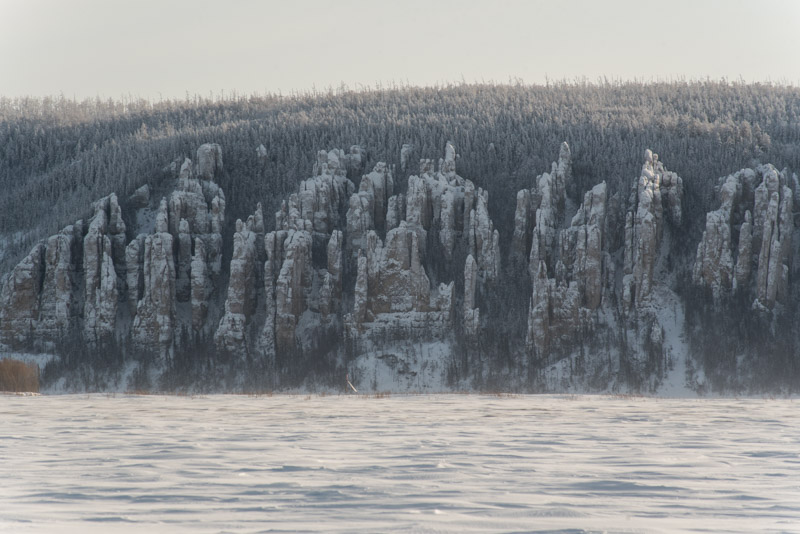Emerging from the fog of Yakutsk, it’s a clear, cold morning; the temperature has jumped to -30º C but there is a bitterly cold wind which makes me feel colder than I have ever felt. I top the car’s tank up in Pokrovsk, foolishly venturing out of the car without a hat on and soon getting frostnip in the top of one ear. The road becomes smaller and very quiet until, in the village of Ulakhan-An, I follow a sign marked ‘avtozimnik’, descend the long bank of the Lena then venture onto a bulldozed but lumpy ice road. It is one thousand kilometres to Lensk and there is no alternative route to the ice road (apart from a private oil-company road which foreigners are barred from using). The ice road soon improves, tracking the Lena’s left bank and becoming a wide carriageway of smooth, translucent, deep blue ice. It’s a joy to drive on this section and I’m thrilled to be living out another experience I have long dreamed of, the Hilux Surf once again performing flawlessly. In the early afternoon I reach the Lena Pillars; beautiful eroded stone columns on the river’s distant right bank. A track across the river ice to the pillars is barred and the wind is unbearable, so I enjoy the sight from the warmth of the car with a cup of tea, watching eddies of windblown snow scurry across the ice surface.