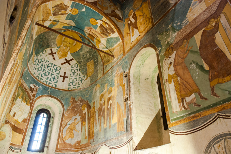After a walk along the lake-shore, whose sandy beach is scattered with driftwood, watching distant ships crossing the lake, which is part of the Volga-Baltic waterway, I head east on an unsurfaced road, taking a free ferry across a narrow reservoir to the town of Kirillov. Soon after coming under the control of the Grand Duchy of Moscow in the end of the fourteenth century, these remote northern territories of the Russian heartland became a refuge for monasticism, and their remoteness has seen them escape many of the ravages of Russian history. The first of two monasteries is the Kirillo-Belozersky Monastery in Kirillov itself, picturesquely set on the banks of Lake Siverskoye and notable for its huge defensive walls with distinctive towers. A few kilometres away in the village of Ferapontovo is the second, Ferapontov Monastery which is less architecturally vibrant than Kirillov, but contains a collection of magnificent frescoes. Painted by the Russian master Dionisius in 1495-96 and quite staggeringly complete and unmolested, the frescoes cover every wall and roof in the interior of the Cathedral of the Nativity, making it the last medieval church in Russia with intact frescoes.