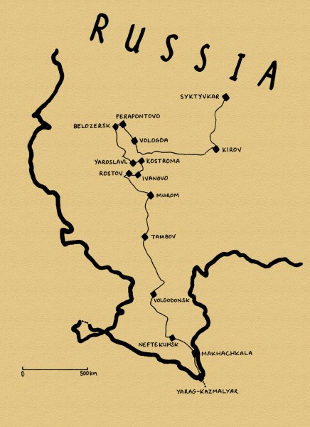 The first of these would be the main focus of my 2015 journey. After entering the far south of Russia from Azerbaijan, this stage would take me right across European Russia to its eastern boundary in the vast wilderness of the North Urals, then north to the shores of the Arctic Ocean. Between these natural boundaries I would stop in some of Russia’s most ancient cities, before turning my attention to the beautiful landscapes and twenty-four-hour daylight of the country’s far north and completing a completing a ten thousand kilometre journey across Russia’s European heartland on the Estonian border.