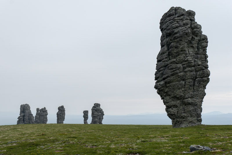 The fourth day starts calmly beside the Ydzhydlyaga, before we re-enter the wearying forest; though after some hours the very faint path starts to climb, finally leaving the swamps. Here I get a surge of motivation and pass Alexander and our guides, keen to reach the ridgeline before it clouds over. I climb briskly beyond the treeline at about 600 metres elevation, topping the ridge at around 750 metres, a few hundred metres distant from the giants. The view is simply astounding and all the miserable slogging through the forest is quite forgotten. Here is one of the most singularly striking natural wonders I have ever seen, with the seven stone towers of Manpupuner perched on the treeless alpine tundra of the ridge, overlooking a veritable ocean of forest stretching to the northern and western horizons, punctuated only very distantly by the bare ridges of the Urals and absolutely devoid of any trace of human presence. This thankfully protected forest is part of the largest swath of primeval forest remaining in Europe today. To the south and east are more bare ridges, demarcating the notional border between Europe and Asia.