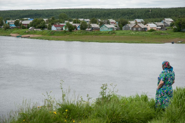 I leave Arkhangelsk and initially double back on the main highway towards Moscow, then join smaller, mostly unpaved roads which lead towards the Onega River. After several hours driving through the endless taiga, I reach the town of Plesetsk, connected to Russia’s Plesetsk Cosmodrome. Once an ICBM launch site, today Plesetsk is used for occasional high-latitude satellite launches and I know that a launch is imminent, but no firm date has been published. I later find a Soyuz launch took place the following day. The road eventually crosses the Onega near the village of Sholokhovskaya. It’s late in the evening, twilight is slowly descending and I stop at what is a blissfully tranquil spot; on the one side is the pretty village perched on the riverbank, with a skyline dotted by ancient, slightly dilapidated wooden steeples and domes, whilst on the other, a fisherman silently punts a canoe across the wide, millpond water of the Onega, whose surface is only very faintly disturbed by the very light drizzle.