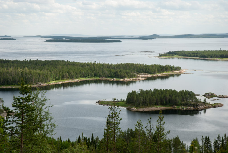 At midday I begin a long drive, leaving Kargopol on an unsurfaced road heading westwards and entering the Republic of Karelia, the homeland of the Karelians who live on both sides of the Russia – Finland border. Karelia is subtly beautiful; a land of ancient forests and meadows dotted with small, wild lakes and neat villages. There is somehow something softer, more European about it than other parts of the north and I immediately warm to it. Like Arkhangelsk Region it is home to some fine pieces of wooden architecture and so despite the persistent rain, I stop in the village of Pyalma which sits almost on the shore of Lake Onega and has a quaintly miniature wooden chapel in a small graveyard. Late in the afternoon I join the main M10 Highway connecting Saint Petersburg with Murmansk on the Arctic Coast and drive steadily north as far as the Kem River, where I camp on the shores of a reservoir, watching an otter swimming on its back and later hearing an owl hoot in the trees directly above me.
